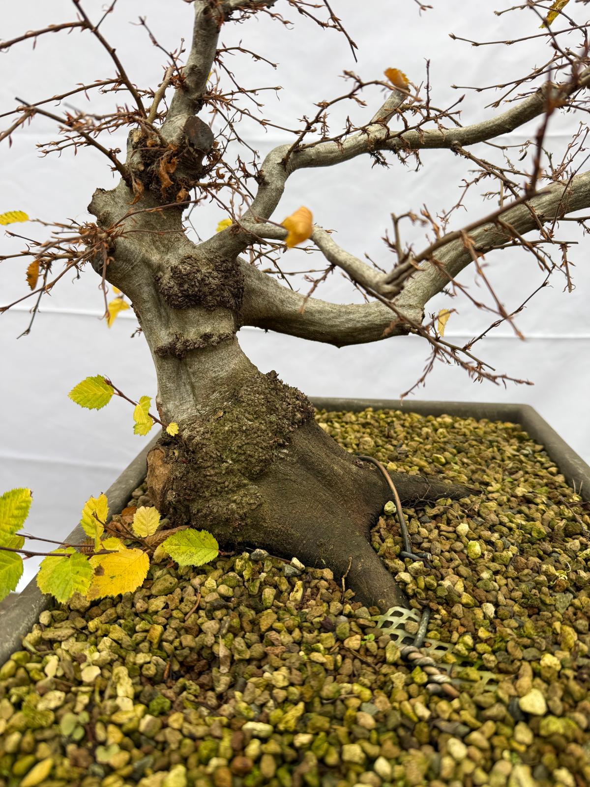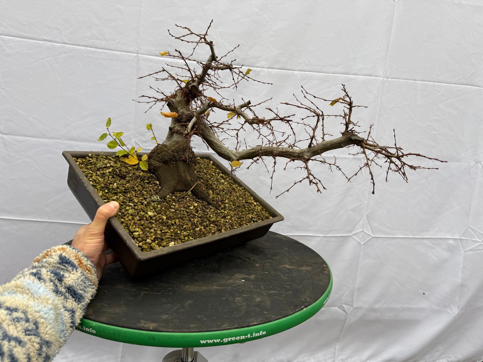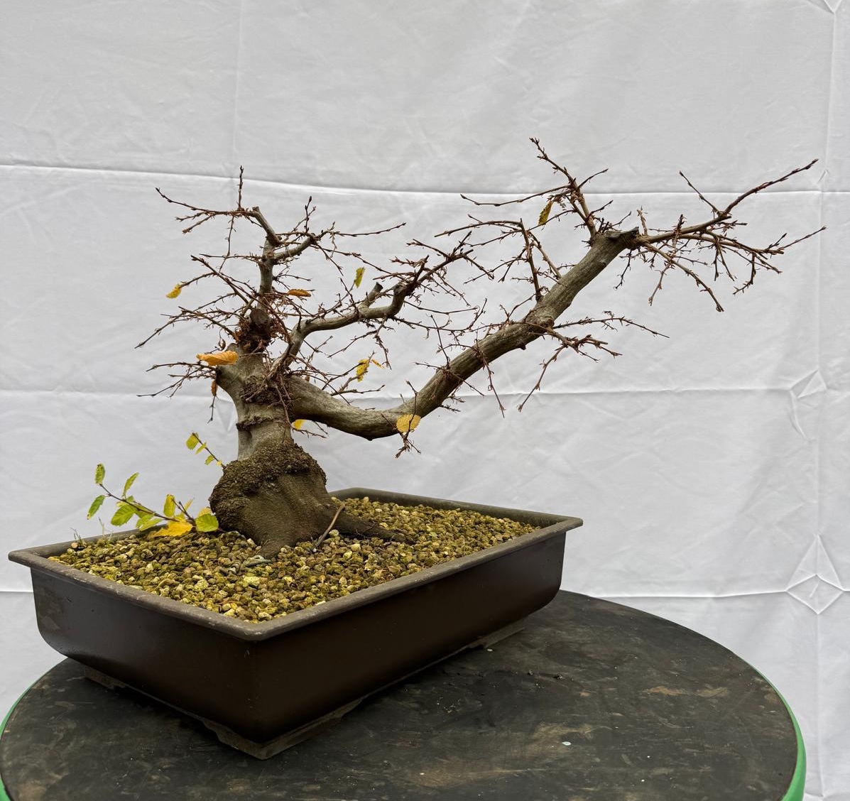A smaller-sized Oriental hornbeam yamadori that still draws attention through its strong trunk and mature character. Well-developed hornbeams of this size are not very common, and this tree shows a convincing sense of age within the kifu category. The foliage is compact, complemented by a long branch that adds movement and direction to the composition.