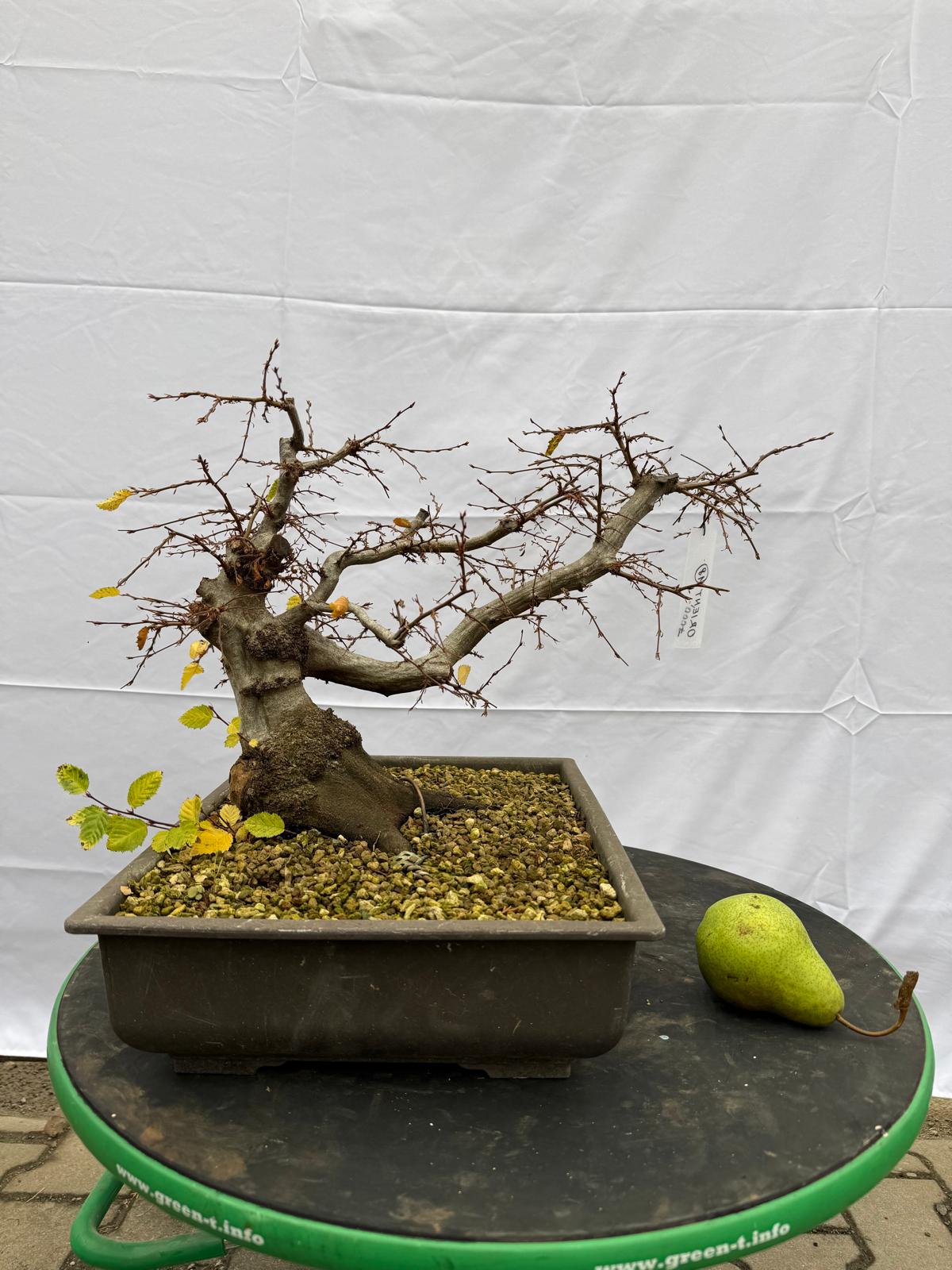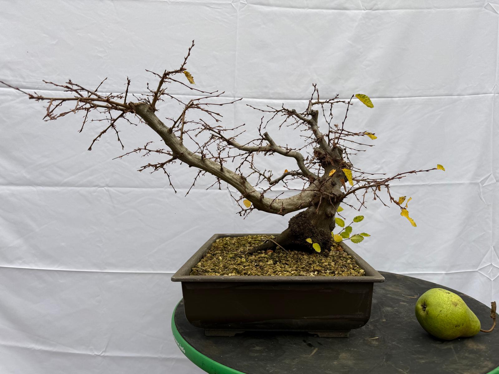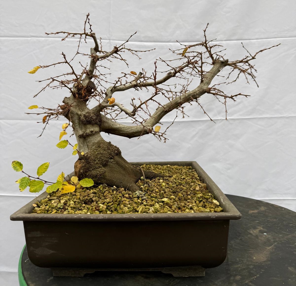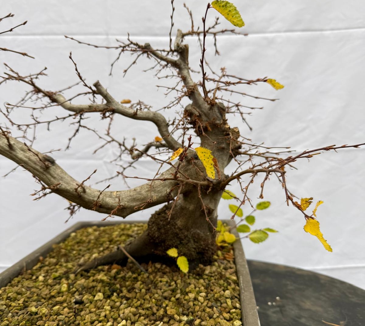 A smaller-sized Oriental hornbeam yamadori that still draws attention through its strong trunk and mature character. Well-developed hornbeams of this size are not very common, and this tree shows a convincing sense of age within the kifu category. The foliage is compact, complemented by a long branch that adds movement and direction to the composition.