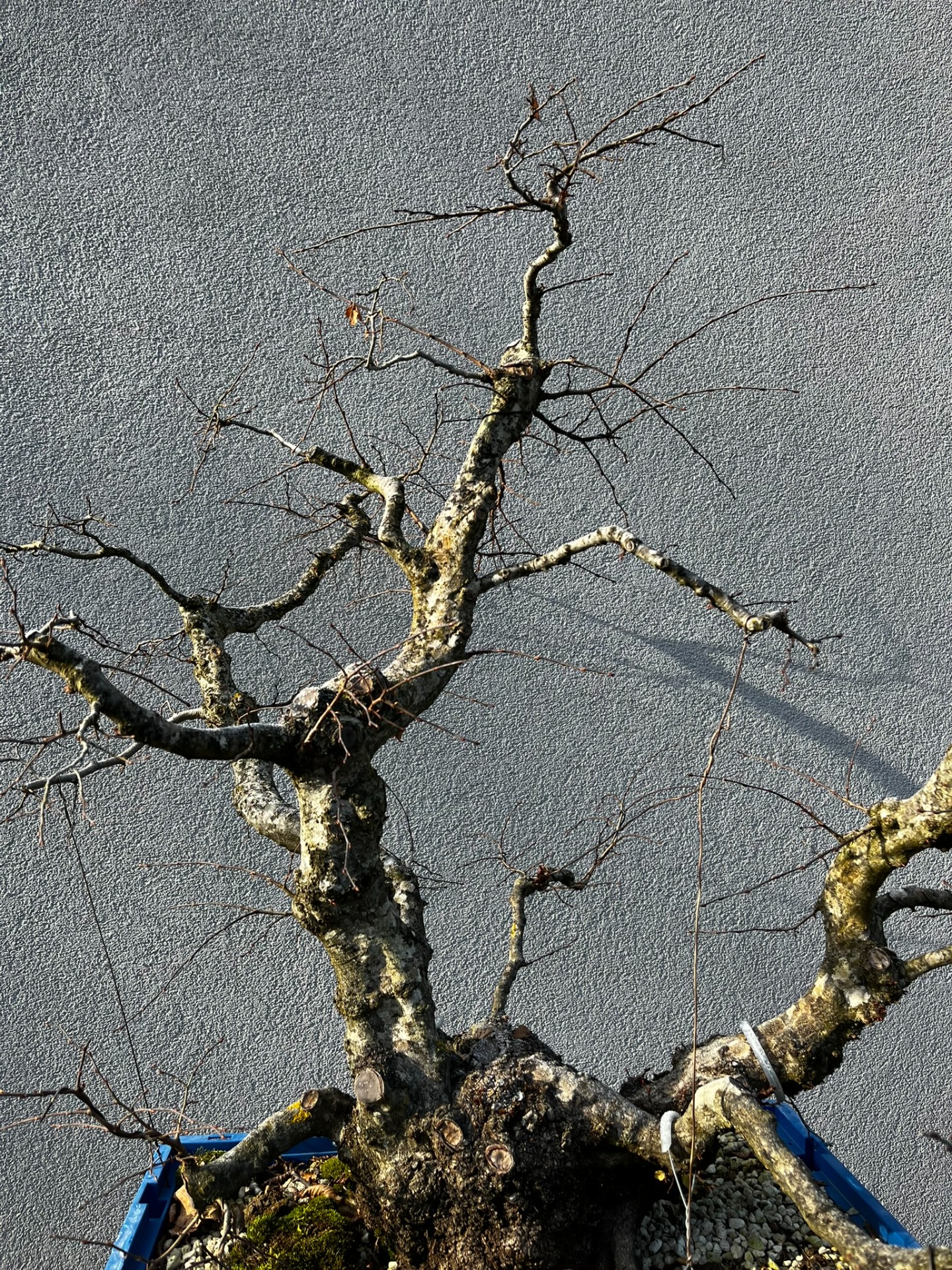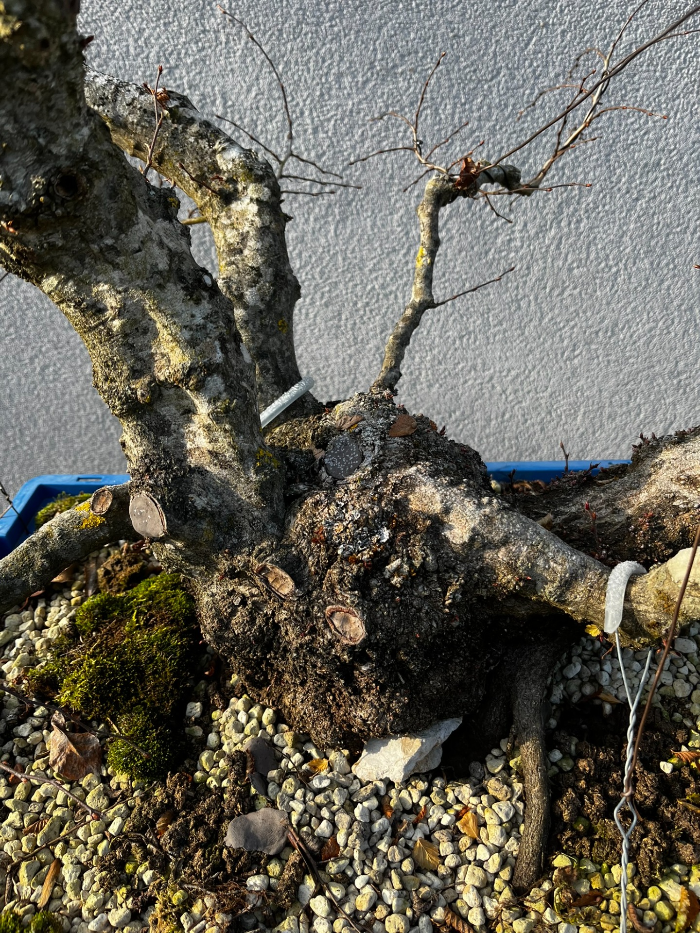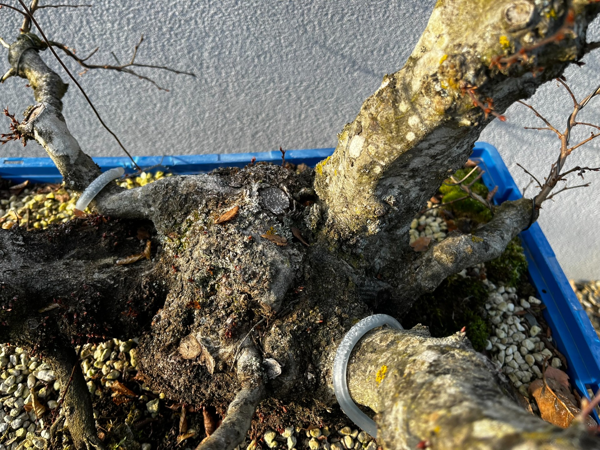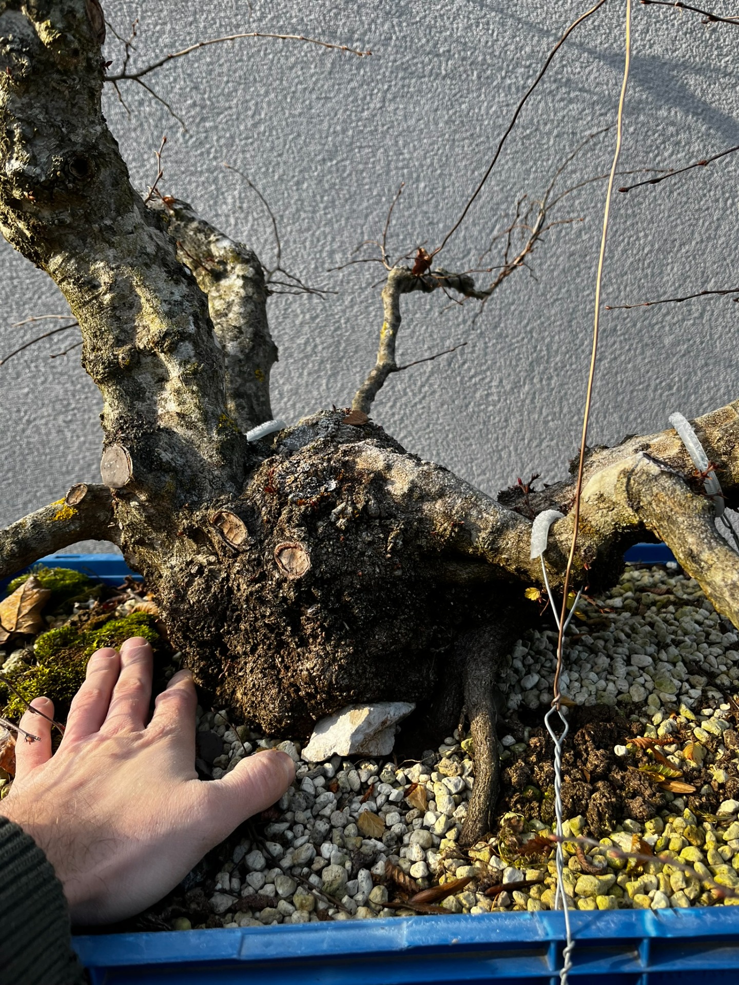 An outstanding yamadori featuring several trunks of varying thickness emerging from a powerful shared base. As a unique and natural detail, stones have become embedded within the base, enhancing the sense of age and connection to its original landscape. The trunks are dynamic and well distributed in space.