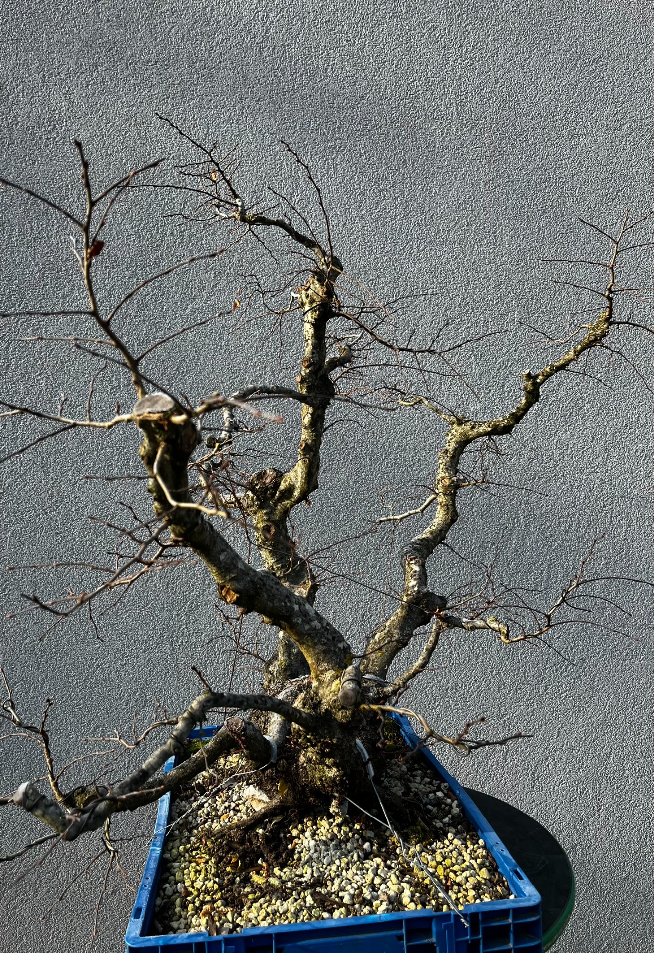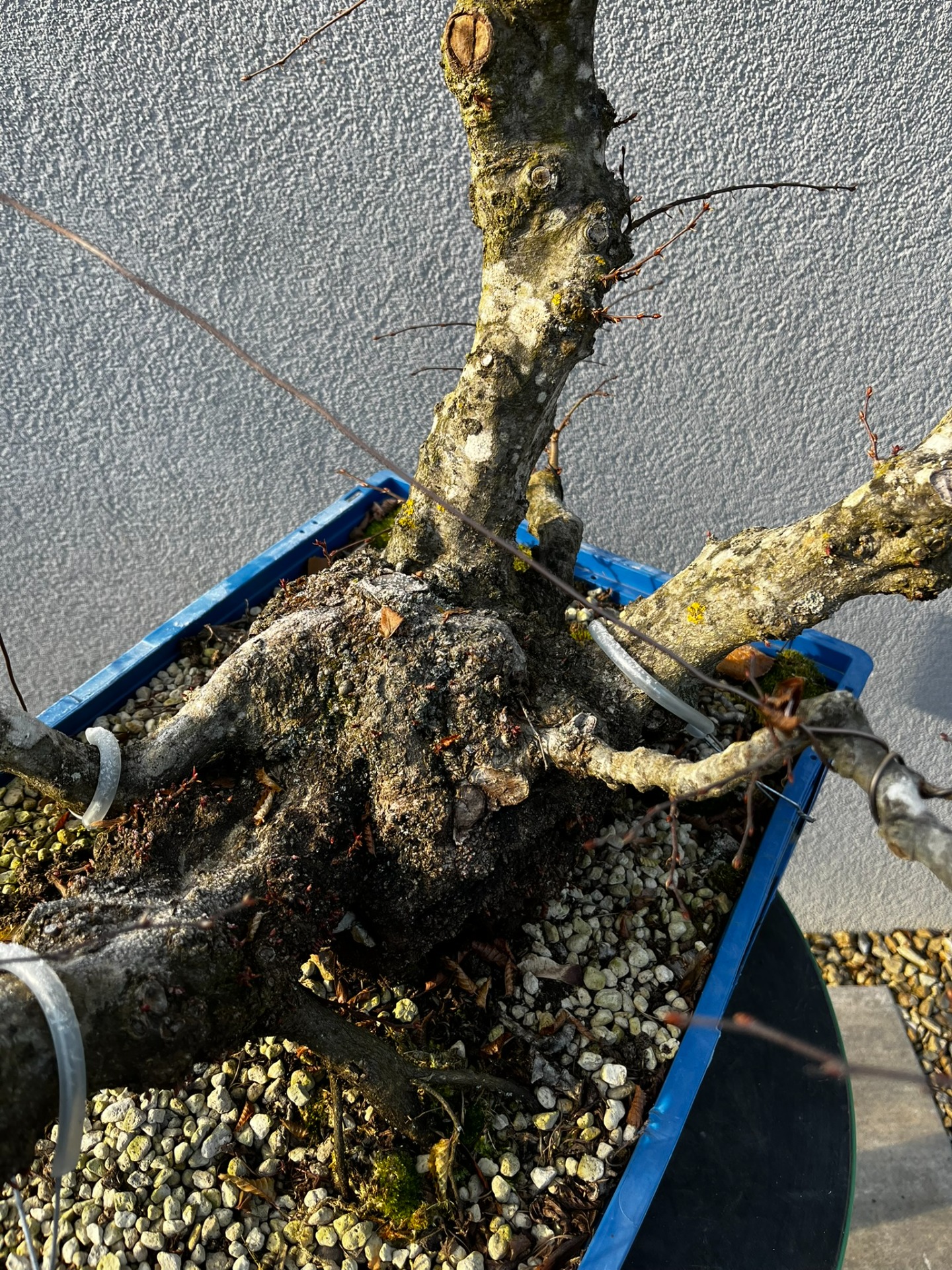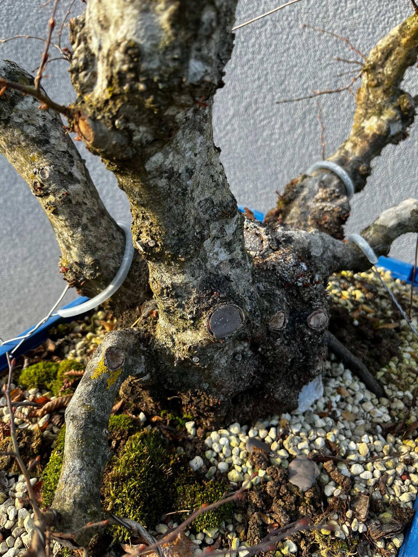 An outstanding yamadori featuring several trunks of varying thickness emerging from a powerful shared base. As a unique and natural detail, stones have become embedded within the base, enhancing the sense of age and connection to its original landscape. The trunks are dynamic and well distributed in space.