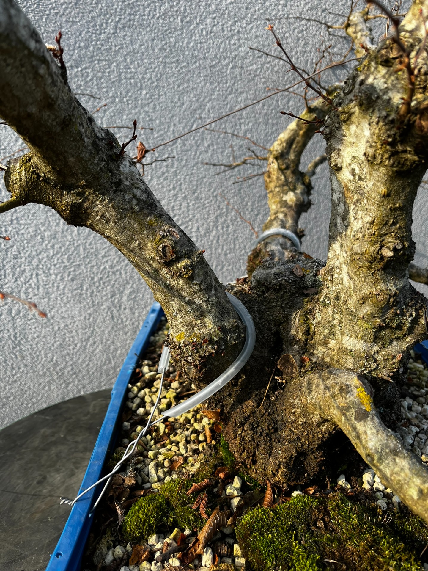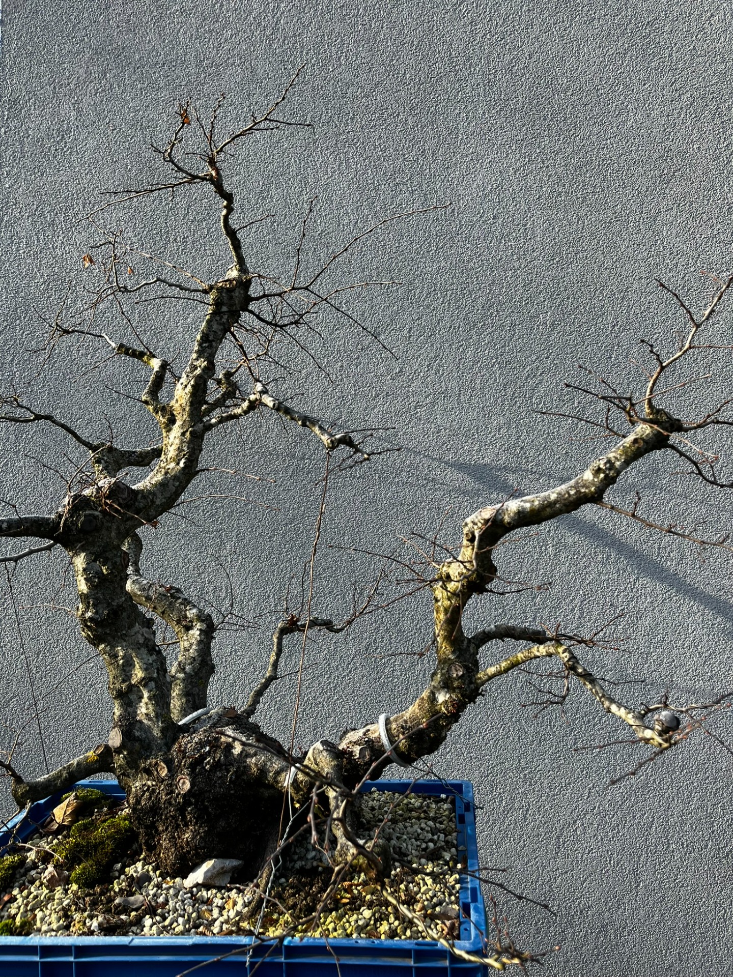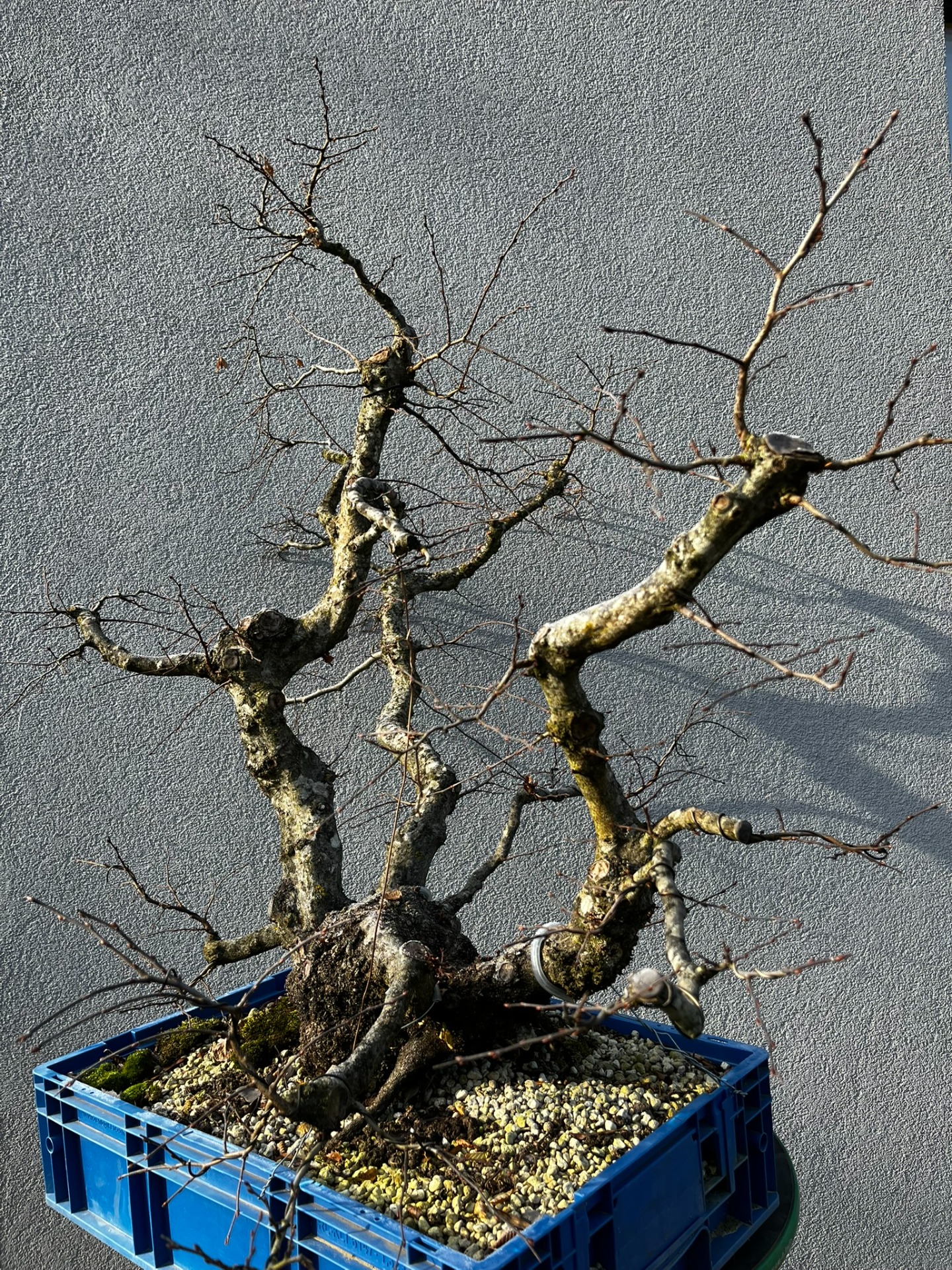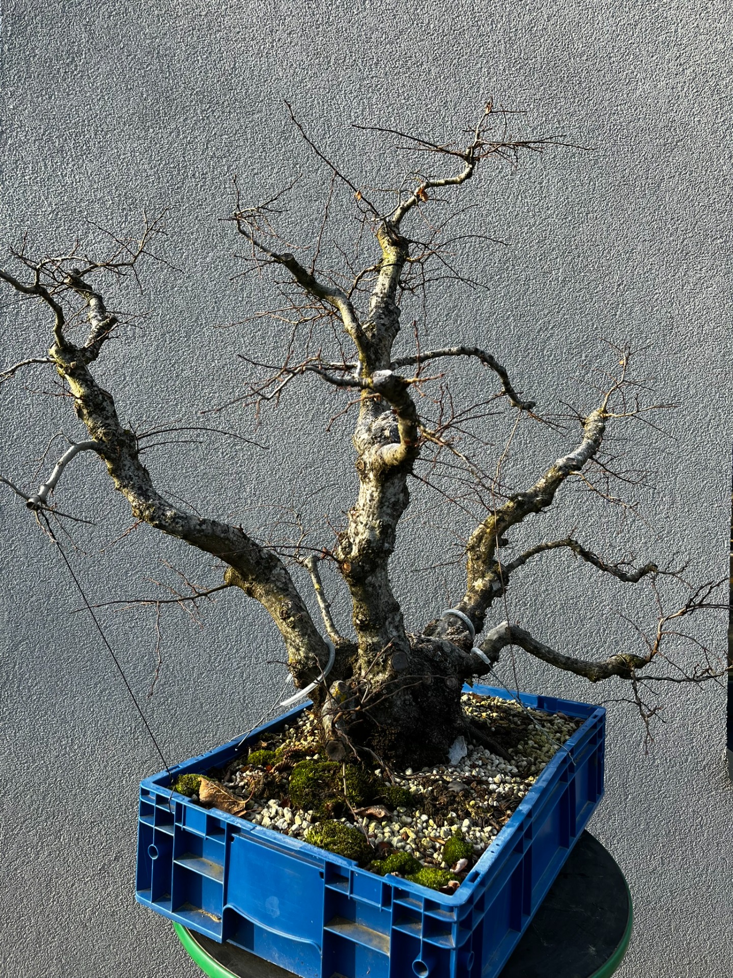 An outstanding yamadori featuring several trunks of varying thickness emerging from a powerful shared base. As a unique and natural detail, stones have become embedded within the base, enhancing the sense of age and connection to its original landscape. The trunks are dynamic and well distributed in space.