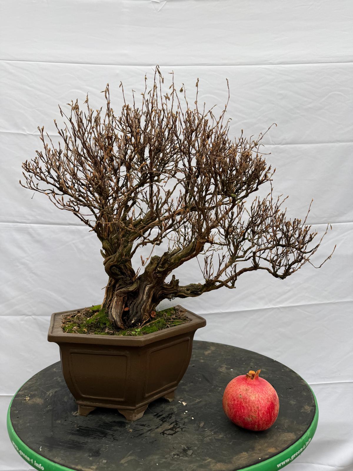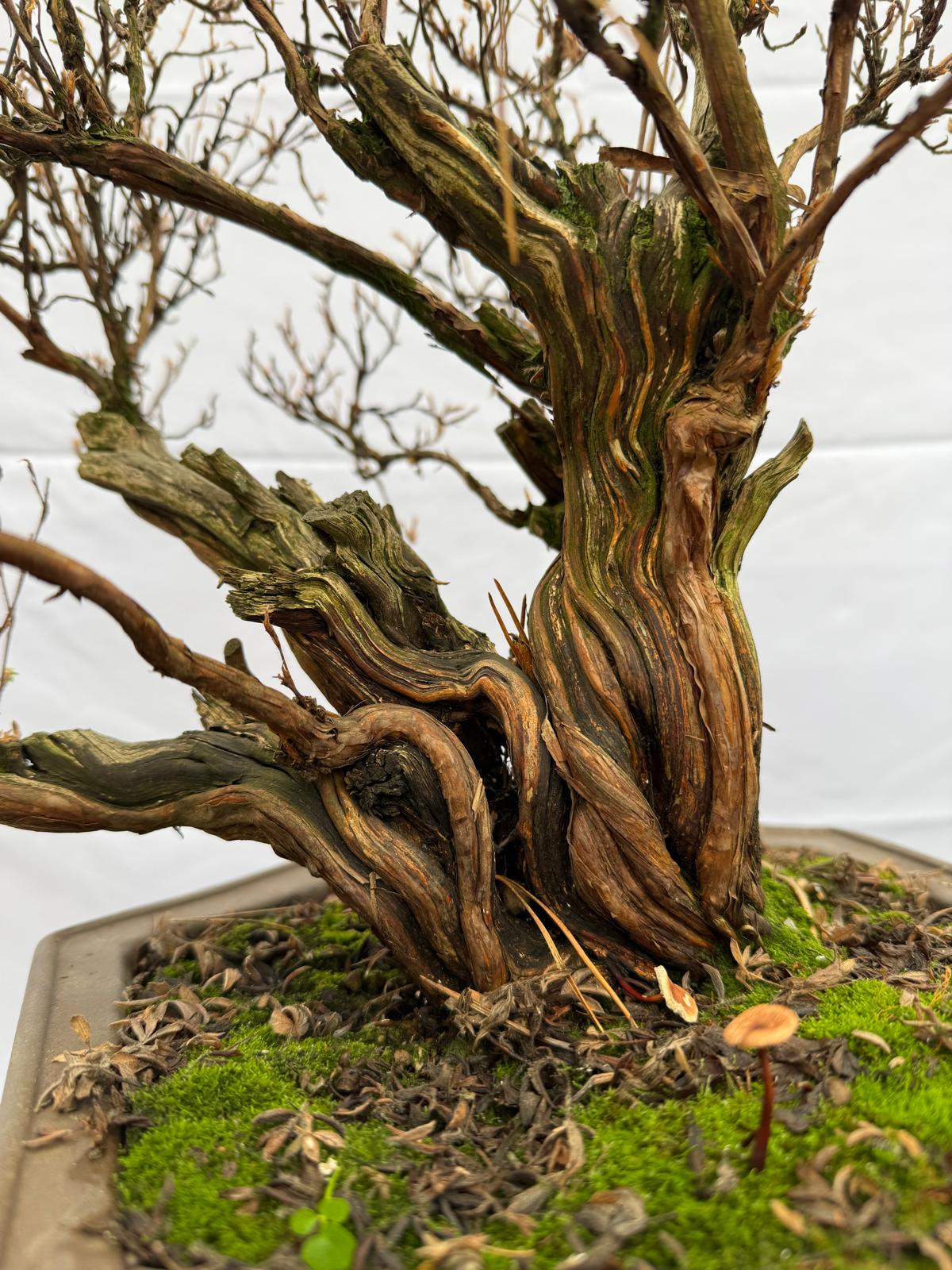 A shrubby potentilla that has been cultivated over a long period of time and is very well developed. The tree is close to a presentation state and offers good material for further detailed work. The structure is mature and balanced, complemented by attractive deadwood that adds character.